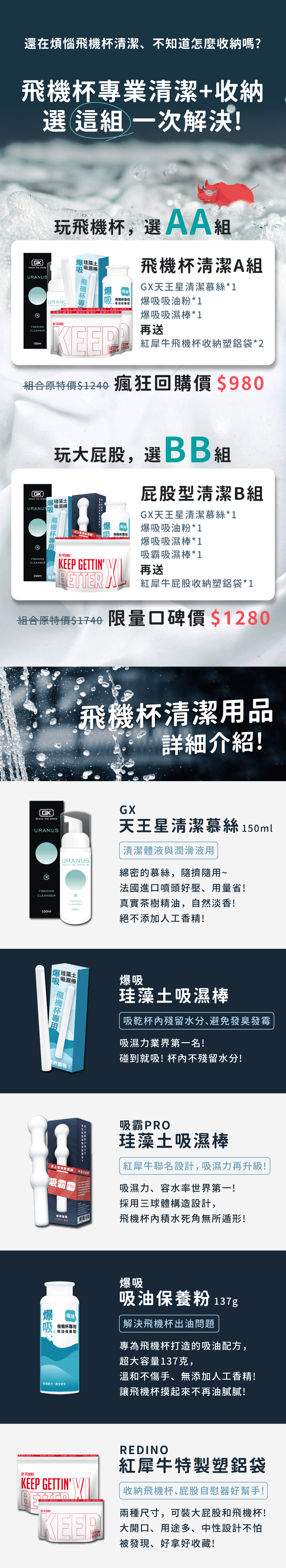 💦 GX天王星清潔慕斯+紅犀牛™吸霸®PRO棒+爆吸®吸濕棒+吸油保養粉+大型飛機杯收納塑鋁袋! > BB組